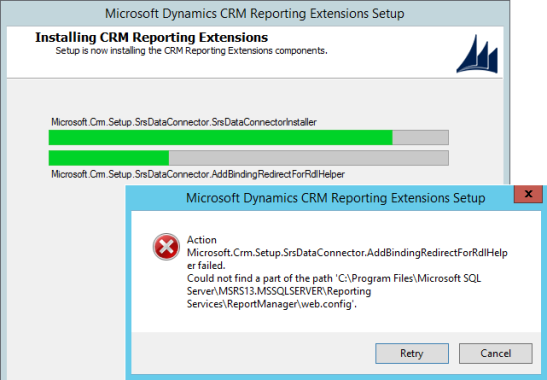 Action Microsoft.Crm.Setup.SrsDataConnector.AddBindingRedirectForRdlHelper failed.