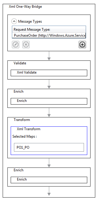 Verder is er een Enterprise Application Integration projecttype, met daarin een Bridge Configuration. Het idee achter de Bridge is een VETE pipeline (Validate, Enrich, Transform, Enrich) waarin we het XML document kunnen bewerken. De bridge moet gekoppeld worden aan de buitenwereld, dit kan een koppeling met de Azure Service Bus zijn(queue, topic, relay), of een webservice, of een externe Line Of Business (LOB) adapter naar SQL, SAP, Oracle of Siebel.