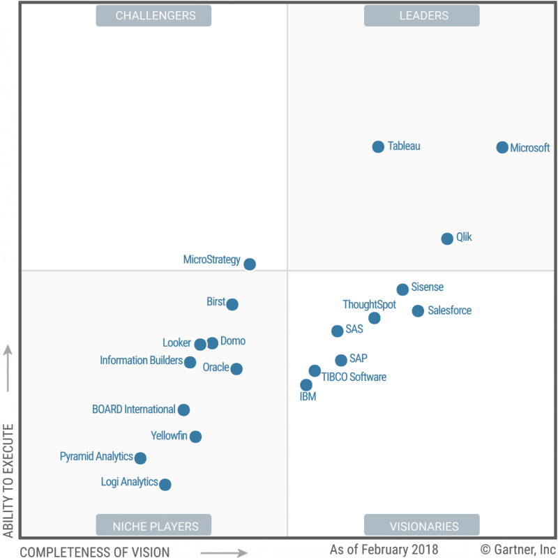 Vergeleken met het quadrant van vorig jaar, valt op dat het drukker is geworden rond de grens van Visionaries en Leaders. Sisense en Salesforce zijn helemaal naar boven gekropen in het Visionaries segment, ThoughtSpot is zelfs het Leaders segment binnengedrongen. Verder valt op dat Tableau een betere Ability to Execute lijkt te hebben.
