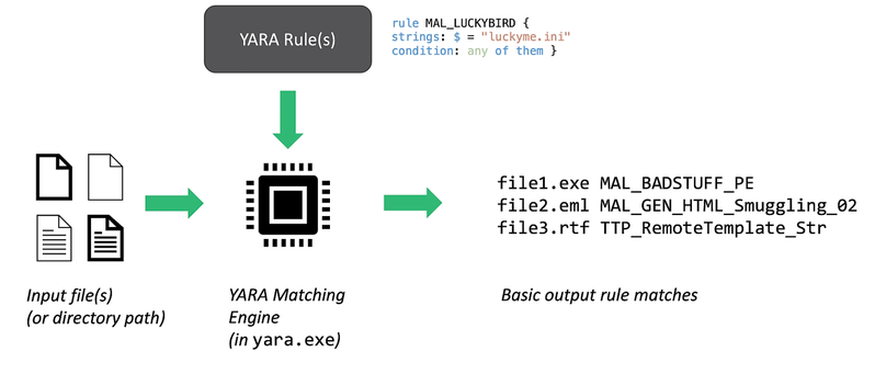 Door deze overwegingen in acht te nemen, kunnen YARA-regels effectiever en veiliger worden ingezet om systemen te beschermen tegen aanvallen, terwijl ze tegelijkertijd de risico’s van blootgestelde beveiligingsinformatie minimaliseren. Het regelmatig evalueren van de effectiviteit van deze regels is essentieel voor het handhaven van een robuust beveiligingsbeleid. Zie onderstaand een voorbeeld over de logische, procesmatige afhandeling van YARA regels op verschillende bestanden.