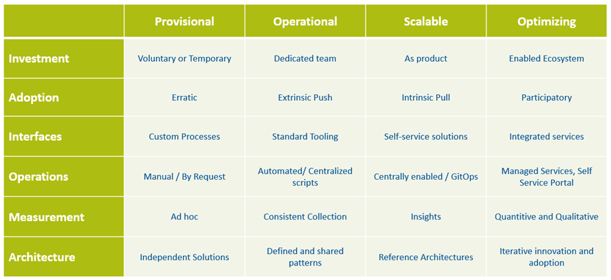 Het idee van een maturity model is niet nieuw. De Cloud Native Computing Foundation (CNCF) publiceerde eerder een Platform Engineering Maturity Model om organisaties te helpen reflecteren op hun volwassenheid en verbeterkansen te identificeren. Het CNCF‑model onderscheidt aspecten zoals Investment, Adoption, Interfaces, Operations en Measurement, elk met vier niveaus van volwassenheid: Provisional, Operational, Scalable en Optimizing. We lichten die hier niet verder uit; ze vormen het vertrekpunt.